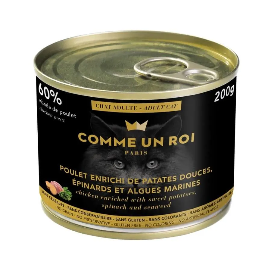 La pâtée pour chat sans céréales de Comme Un Roi sera le coup de coeur de votre nouveau compagnon. Cette alimentation complète humide 100% naturelle est sans céréales. Elle répondra aux besoins nutritionnelles de votre félin grâce à sa recette composée de produits de hautes qualités et à l’ajout de vitamines et taurine excellent pour la santé de votre chat. La pâtée Comme un roi est riche en protéines, saine et équilibrée pour garantir le bien être de votre animal qui va adorer son bon goût de poulet.