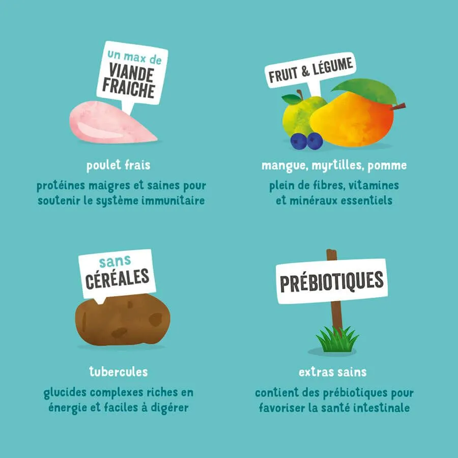 Riche en poulet frais élevé en liberté, cette recette sans céréales est une source incroyable de protéines de qualité supérieure faibles en calories (sans viande séchée ou déshydratée). Elle contient des pré-biotiques pour un intestin en bonne santé. Ces recettes incluent également un mélange super équilibré de fruits et de légumes, et des herbes et des végétaux riches en nutriments pour un coup de boost supplémentaire. Avec une cuisson douce des croquettes pour préserver leurs saveurs et leurs bienfaits.